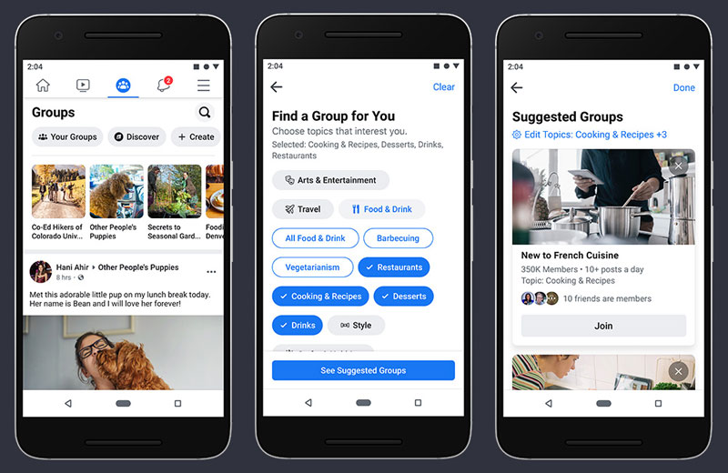 Ο επανασχεδιασμός των Groups θα ξεκινήσει άμεσα στις εφαρμογές iOS και Android, ενώ μέσα στους επόμενους μήνες θα τον δούμε και στη desktop έκδοση του Facebook. Η καρτέλα των Groups θα βρίσκεται το κέντρο της επανασχεδιασμένης menu bar και πατώντας εκεί οι χρήστες θα βλέπουν μια ξεχωριστή ροή νέων αναρτήσεων από τα Groups που συμμετέχουν και προτάσεις για Groups που ταιριάζουν με τα ενδιαφέροντα τους.
